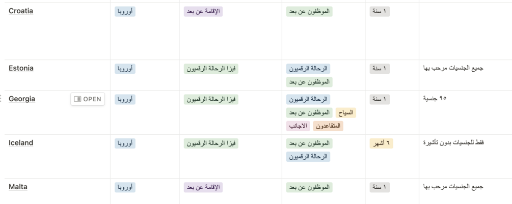 القائمة الأولى في العالم العربي لفيزا الرحالة الرقميون لأكثر من ٥٠ دولة حول العالم، تحتوي على كل التفاصيل والروابط المهمة لكل رحال رقمي يتطلع للانتقال بين دول العالم والعمل عن بعد.هذه القائمة انتجت باستخدام منصة نوشن وهي مفيدة لكل رحال رقمي لتحليل ما ان كانت هذه الفيز مناسبة له ام لا.هذه القائمة تحتوي على ما يلي: